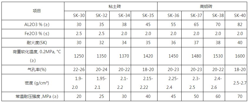 下面介紹下SK32、SK34、SK36、SK38、SK40耐火磚的理化指標(biāo)。